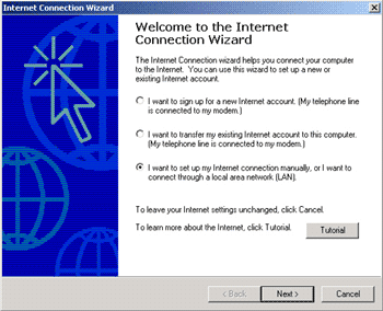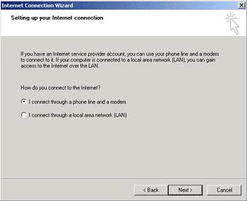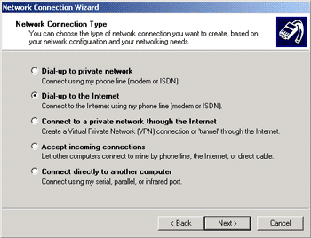 - In the Network Connection Type dialogue, select the Dial-up to the Internet option.