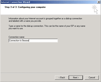 - Now you are asked to provide a Connection Name - this is simply the name you wish the connection to be known by. For ease of use, just choose your ISP name.