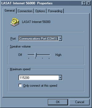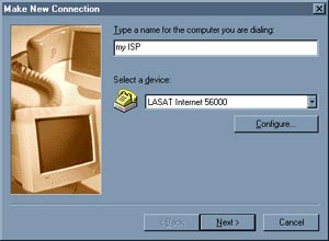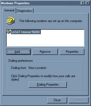 Now, turn your attention to the field "Select a Device." Here you should find the name of your modem you have installed (in this example, a LASAT Internet 56000). Simply click the small arrow in the rightmost corner to activate the scroll-bar and find your modem in the list.