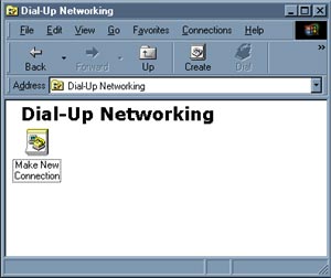 | [Step 5:] The Dial-Up Networking window opens, and if you have not already made a Dial-Up Networking (DUN) connection, the window will be empty except for the icon Make New Connection - double-click this icon |