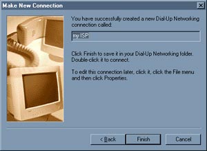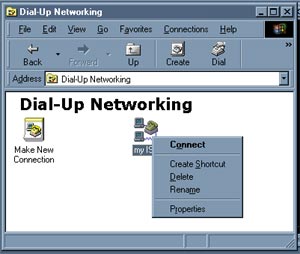 When the installation is complete, you are returned to the Dial-Up Networking Window, where the new connection you have just made now appears (in this example, myISP) |