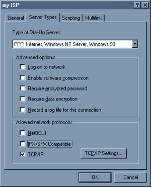 In the field "Type of Dial-Up Server", you make sure that the value "PPP; Internet; Windows NT Server; Windows 98" is selected.