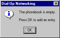 [Step 2:] If this is the first time you have selected Dial-Up Networking, then you will get the following pop-up window. Press 'OK' to move on to the 'Phonebook entry' screen.
