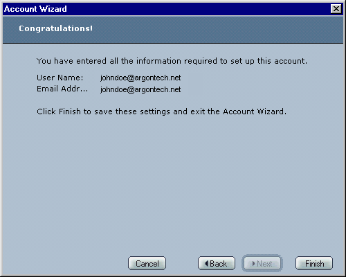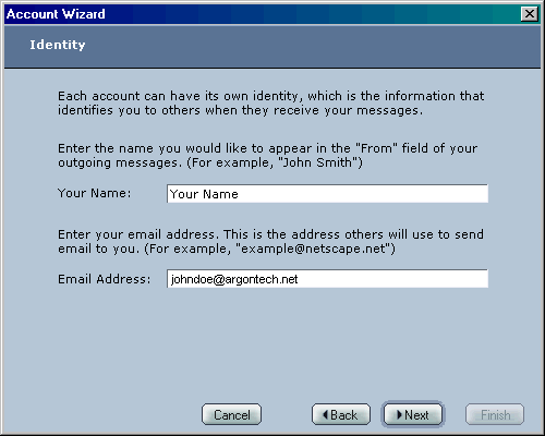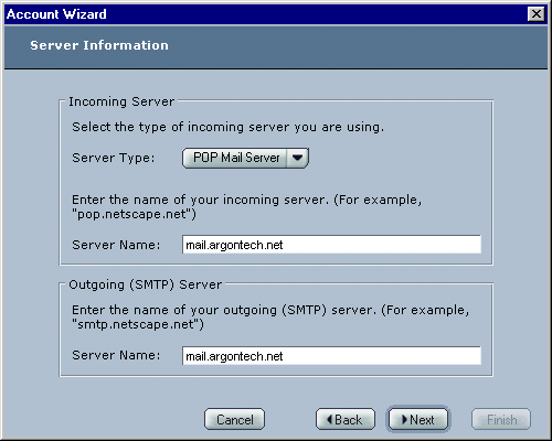 In the Incoming Server and Outgoing Server fields, type mail.argontech.net.